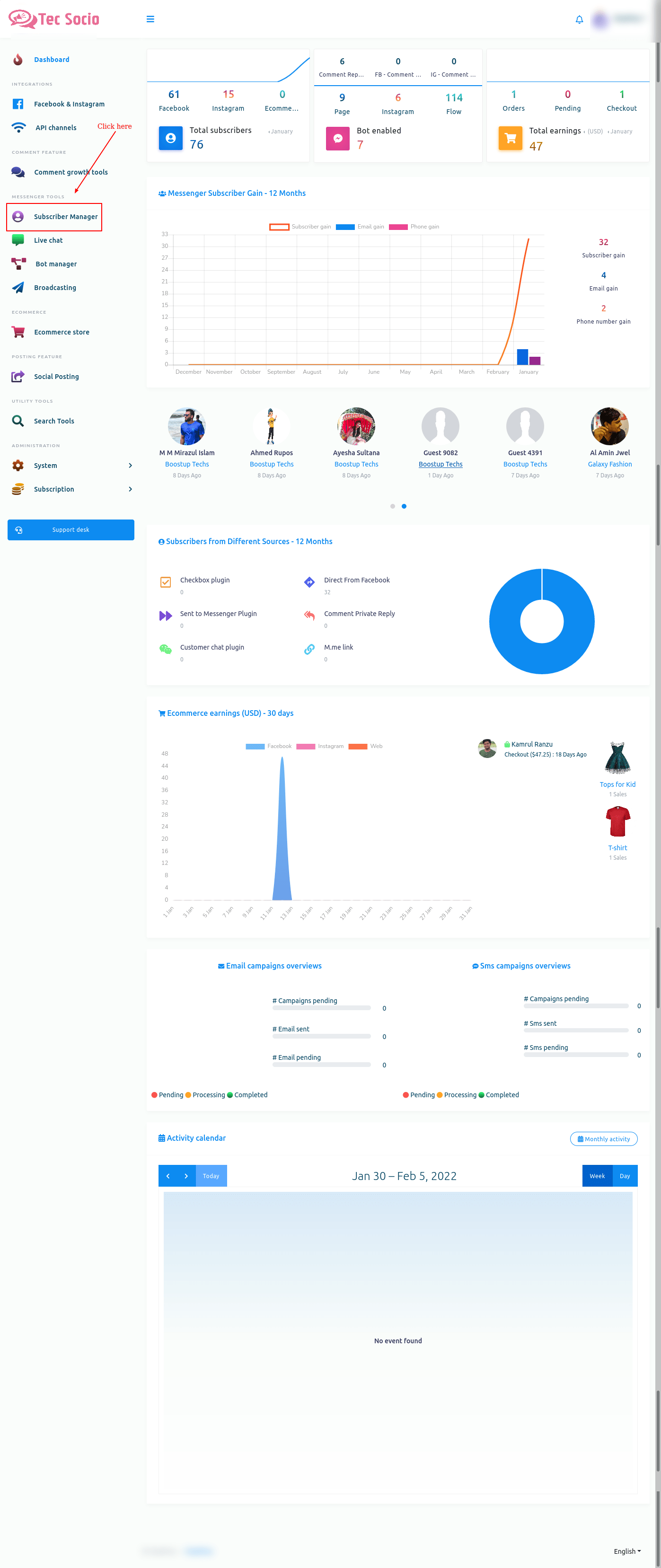 First, go to the dashboard of the Tecsocio. At the left sidebar of the dashboard, you will see a menu called subscriber manager. Click on the subscriber manager menu.