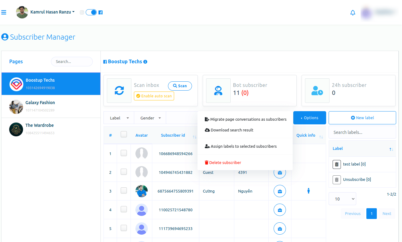 With the subscriber manager feature of Tecsocio, you can see all of your subscribers. And you can scan subscriber lists and enable auto scan and search subscribers. Moreover, you can migrate page conversations as subscribers, download search results, assign labels to selected subscribers, and delete subscribers.Besides, you can create New labels on the page.